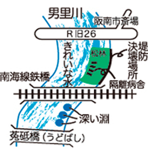 現在の川面は水流が細り、雑草が茂って見る影もありませんが、昭和27年の阪南市鳥取池の決壊による水害(南海男里川鉄橋の山手側左岸のカーブの部分が決壊)迄は、このカーブする堤防の内側は松の木が鬱蒼と生い茂る河川敷で、昼でも薄暗い松林の中に戦前に建てられた古い隔離病舎の残骸が残り子供達の肝だめしの絶好の場所となっていました。もちろん現在の国道26号線は未建設で阪南市斎場のあたりはあまり人の寄りつかない淋しい地域でした。男里川の東半分にはいつもきれいな水が流れ、南海男里川鉄橋の下のあたりから下流にかけて、いくつかの深い淵が点在し、子供達の飛び込みも出来る絶好の水遊びの場でした。 (おかあさんチョット2004年4月号掲載) | ||