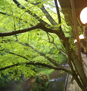 小雨だったので、念願の(?!)渓涼床で本格京料理に舌鼓♪あふれんばかりの新緑のなか