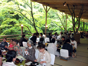 紙屋川のせせらぎをバックミュージックに、参加者の皆様とともに談笑しながらの京料理。