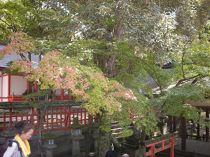 心地よい風が吹き抜け、なんとも気持ちいいひとときを過ごしました。 が、まだまだ行程は続きます。 少しだけ色づきはじめた紅葉を横目に今日がお祭りという手向山八幡宮を通り、若草山で鹿と戯れる校外学習に 来たらしい小学生達を微笑ましく眺めて歩くうちにむさし野に到着。 |