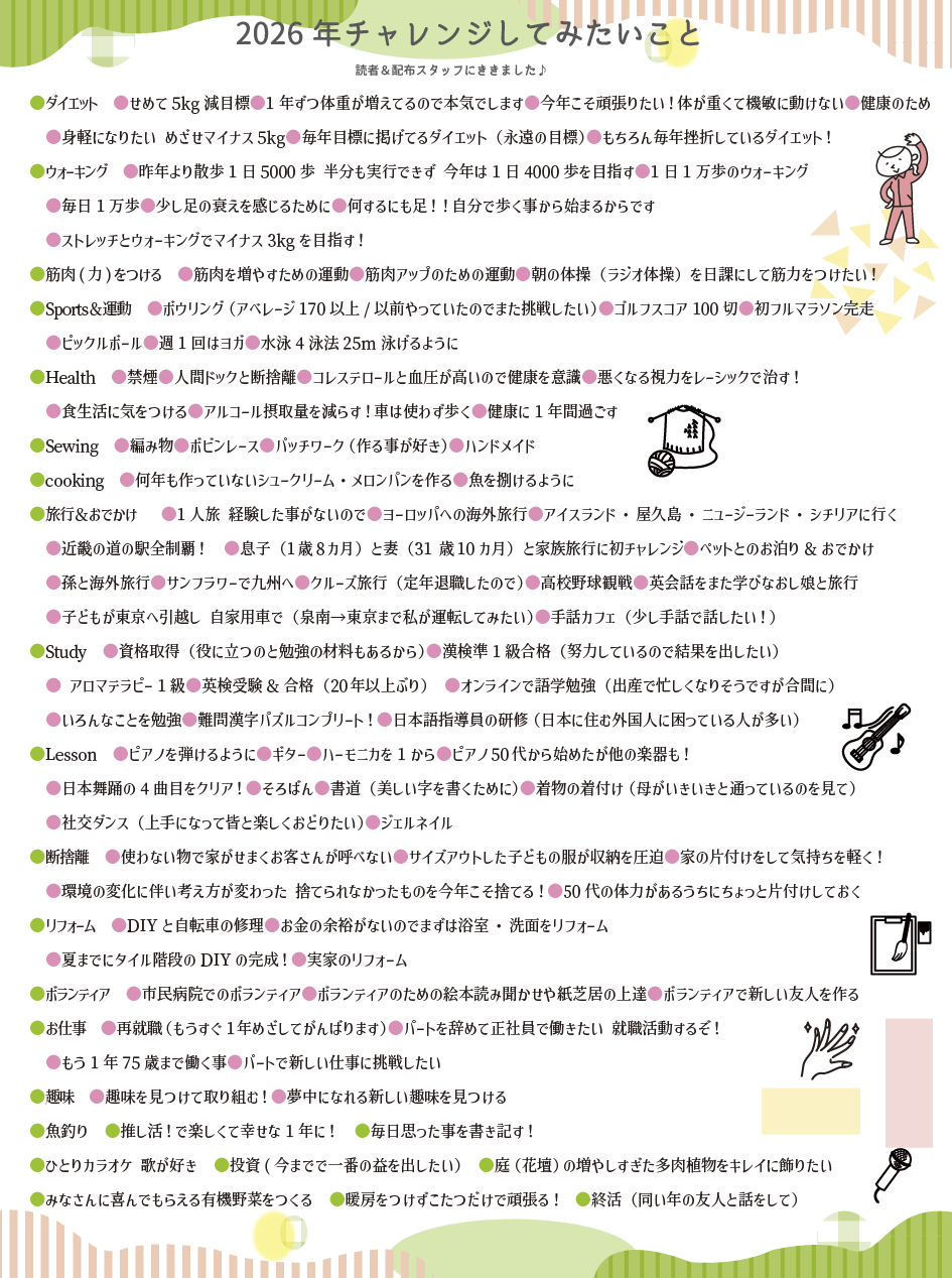 | 2013年を振り返って… 「相変わらずあっという間に過ぎてしまいました。」 「USJの年間パスを持っているので行きまくっていますが、私もバックドロップに乗れてよかったです。」 「災害の多い1年でした(全国的に)。今年もよく働きました(プライベート)。」 「今年もなんとか健康に過ごすことができました。想い出に残ることは、孫の中学校入学です。」 「子どもがはじめて入院・手術をしました。とても心配しました。」 「嵐のコンサートとフランス旅行に行けたこと。」 「1月から仕事をして、毎日が充実!」 「初めて救急車に乗ったこと。」 「GWに富士山に登ったこと。」 「夏から新しい仕事を始め、大変なことが多かった。」 「今年、仕事が変わったので、覚えることがたくさんで大変な日々を送りました。」 「子どもが再就職したこと。」 「ランチも行けて、娘とコンサートにも行けて楽しい1年!」 「結婚している長男が単身赴任で群馬県に行ったこと。」 「娘が一人暮らしを始めて、バタバタの1年。」 「孫が2人とも1才になり主人が還暦を迎えました。忙しい1年でした。」 「4月から着付け教室に行き始め1年楽しかった。」 「頑張っているのが実を結んでいるのだと実感した1年でした。」 「異常気象の多い1年。」 「おかチョのバスツアーがなかったのが残念。」 「首相が思いのほかよく続いている。」 「仕事を変え、サービス介助士の資格を取り、第1歩の年。」 |