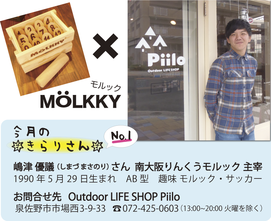 | 北欧雑貨とアウトドア用品のお店を始めようと考えていた時、展示会で出会ったのが1年前。北欧とアウトドアが融合したモルックは「まさにこれだ!」と思いました。自ら楽しみたいと、早速「大阪モルックの会」に参加。身近な地域でも広めたい思いから、「南大阪りんくうモルック」を立ち上げました。 |