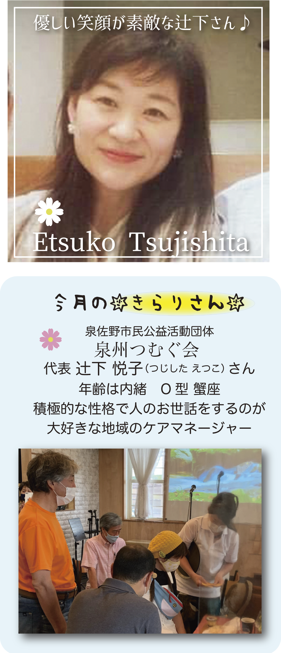 | 介護を提供する側や受ける側、またそのご家族の心労・疲労は大変なものがあります。介護の仕事に携わる中で「自分の人生はこれでよかったのか」とか 「これからの終末の人生が不安、過ごし方がわからない」などと悩む声を20年以上も聴き続けてきました。 それからの私は『もっとそんな人の力になりたい、ちゃんと一人一人に寄り添い、心のよりどころとなるような憩いの場所を地域に作っていきたい!』と思うようになりました。その思いを打ち明けた方々と一緒に、平成30年7月に立ち上げたのが泉州つむぐ会です。 |