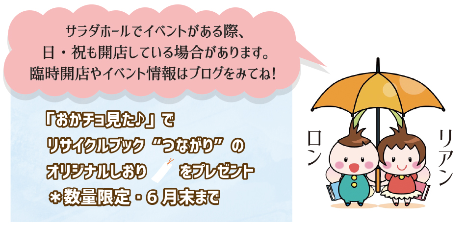 今回はリサイクルブック“つながり”を運営している本のリサイクル運営委員会の森本さんにお話をお伺いしました♪ “つながり”は阪南市立文化センター内、1階つながりスペースで 毎週土曜日10時〜12時・13時〜15時に営業されています。 |
