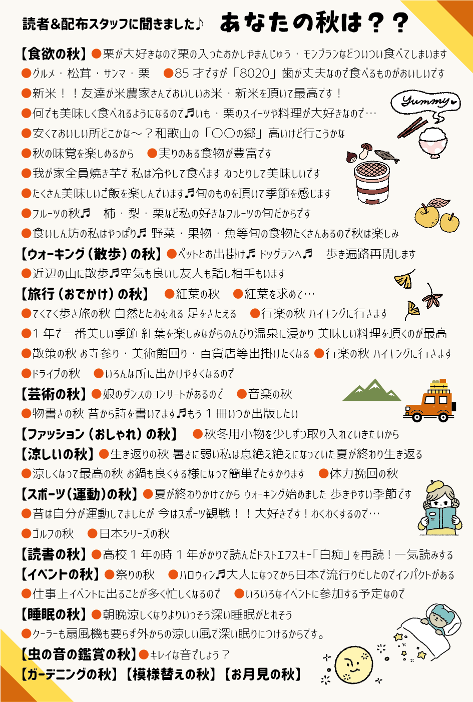 | おかチョ発刊30周年に寄せて〜おかチョエピソードあれこれ〜 最初の頃は府営団地を5階まで上がって入れていました。 今思うと私もまだ若く、子どもと一緒に配布していた頃が懐かしいです。 その子どもも今では2人の子どものパパですが…(熊取町配布Kさん) おかチョを配布していたら、楽しみにしてくれている人がたくさんいる事がわかって嬉しくなりました。(岬町配布Mさん) 配布を始めた頃は小学生だった娘達が、犬を飼いたがりおかチョ貯金をしていました。 我が家に来たワン子も今夏で7才です。三女として2人の娘に可愛がられすぎてとても我がまま娘です!(泉佐野市配布Hさん) 子どもの頃、読ませていただいた「おかチョ」を配布させて頂く事になりました!(阪南市配布Kさん) 配っている時、ご主人の出勤の見送りに来ていた奥さんに手渡したところ、「昔、私も配っていたよ!」と言って頂き、嬉しかったです!(泉南市配布Tさん) 配布していて「おかチョ、本当にいいわ」とか「ここど〜こだが当たったよ」と言っていただき嬉しくなり、配布していて本当に良かったと思いました。私にとっては本当にいい思い出になっています。(田尻町・泉南市配布Hさん) 個人的には25年配布しています。一度もかかさず配布できること、健康に感謝です。紙面は時代によって変化します。それでいいと思います。継続は力です!(阪南市配布Tさん) おかチョは配っていてもイヤな顔をされたことがありません(熊取町配布Kさん) カラーに変わったことで読みやすいなどの言葉をいただいたりしました。主婦・女性の方は飲食系に興味があるようです。(阪南市配布Oさん) 紙面がカラーになってわくわくしました。(泉佐野配布Kさん) おかチョを配っていると友人に話した時「毎月楽しみにしている」と言ってくれた。(熊取町配布Kさん) 何かのご縁で配布させていただくことになりありがとうございます。自宅と離れたエリアを配布していますが、まるでご近所さんのように挨拶しながらのポスティング、とても元気が出ます。笑顔が見られることって本当に幸せですよね。大先輩の方々に「おかチョさんね!いつもありがとう!」「楽しみにしてるから毎月入れてよ!」と言われると本当にやっていてよかったと思います。(阪南市配布Kさん) 配布していて「待ってたよっ!」とか「いつも読んでます」と言ってもらえることがあり、配り甲斐があるなと思い、嬉しい瞬間です。(泉佐野市配布Kさん) |