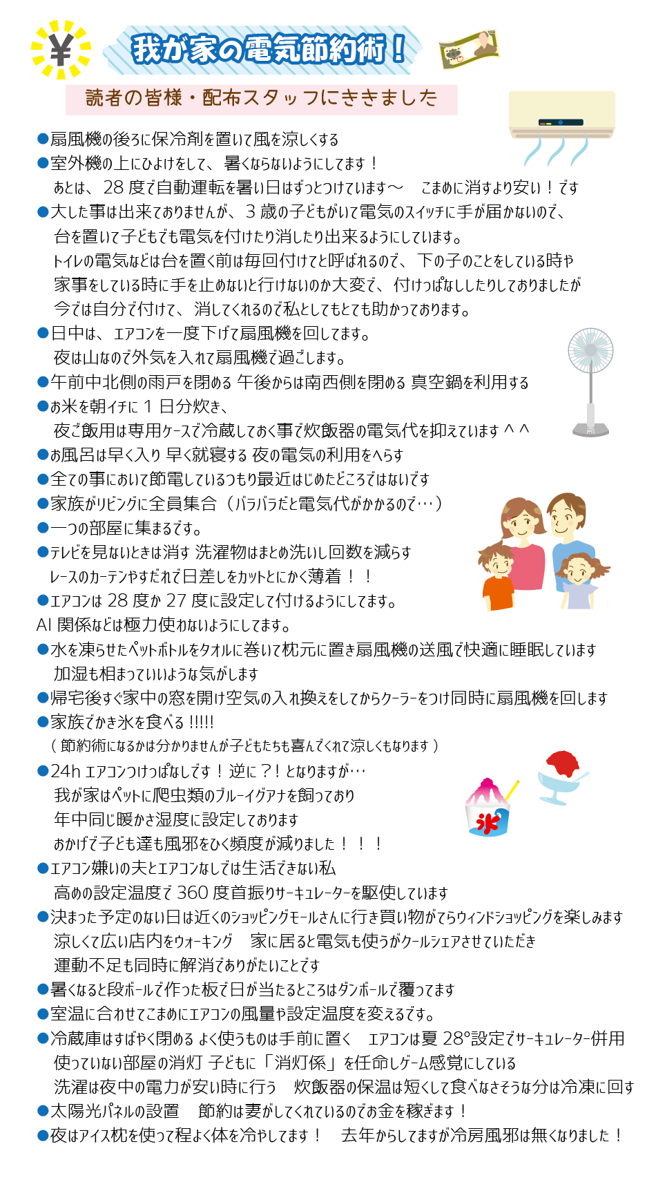 | 節電の夏!涼しく過ごす工夫 すだれ・よしず 家事は夜と朝にする 太陽光を家に入れて明かりをつけない 風呂の残り水で打ち水 昼間、休日は大型スーパーなどへでかける クール商品を試してみる 水枕で寝る 体をぬらして、拭かずに扇風機にあたる 緑のカーテン 汗をかいたらシャワー 保冷剤を包んだタオルを首に巻く 部屋の風通しをよくするためにリフォームした |