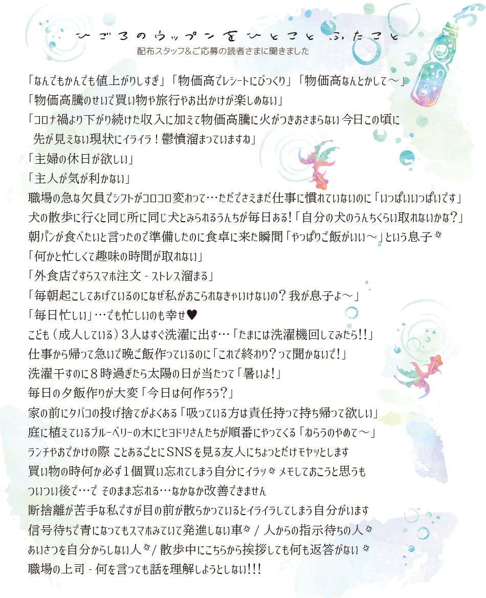 | 幸せを感じる時 「配布している時に海の方を眺めると、とてもキレイでほのぼのした気持ちになり いいところ住んでいるなあっと幸せを感じます。」 「おいしいものを食べている時」 「気の合う友人とおしゃべりしている時」 「ごはんが美味しいなあと思う時」 「ほっとしてインスタントコーヒーとチョコを食べる時」 「ひとりでゆったり読書などを楽しむ時」 「家族4人が元気で楽しく顔を合わせている時」 「花の香りをかいだ時」 「こどもの成長ぶりを感じた時」 「家に居る時」 「目覚めがいい時」 「日々、平凡に過ぎていく時」 「自然(夕焼け・紅葉・若葉・花)にみとれている時」 「初めて見る花に出会った時」 「ひとりの時」 「ペットと遊んでいる時」 「こどもといる時」 「バンドの練習をしている時(沖縄音楽には癒されます)」 「こどもの寝顔・笑顔を見る時」 「家族が幸せと感じている時」 「給料日」 「“ありがとう”のひとことを言われた時」 「家族揃って季節の行事(節分・ひな祭り・十五夜)ができた時」 「家族が笑って話している時」 「結婚したこどもが帰省した時」 「娘や夫に肩を揉んでもらっている時」 「家族みんなそれぞれがんばっている姿を見た時」 「甘いものを食べている時」 「プチおひるね」 |